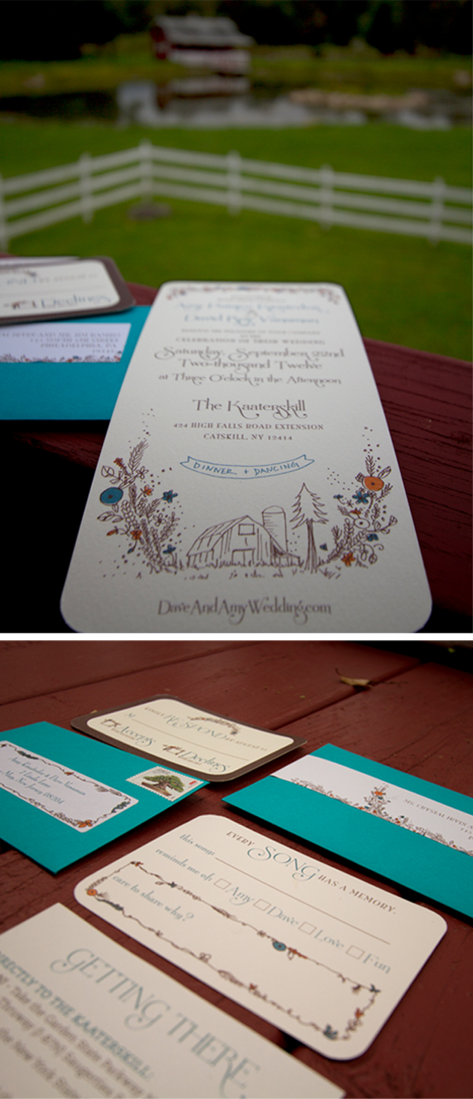 Finished them by the skin of our teeth! Phew. Wedding invitations with hand-drawn illustrations to reflect the barn-style wedding in the mountainous Catskills. Teal envelopes match the bridesmaids’ dresses. Main envelop has a fold-around label with return address on back. Part of the invitation package included a “song card”. Guests get to list a song that reminds them of the groom, the bride, love, or fun. Guests will be surprised with a custom CD giveaway at the wedding with the highlights!